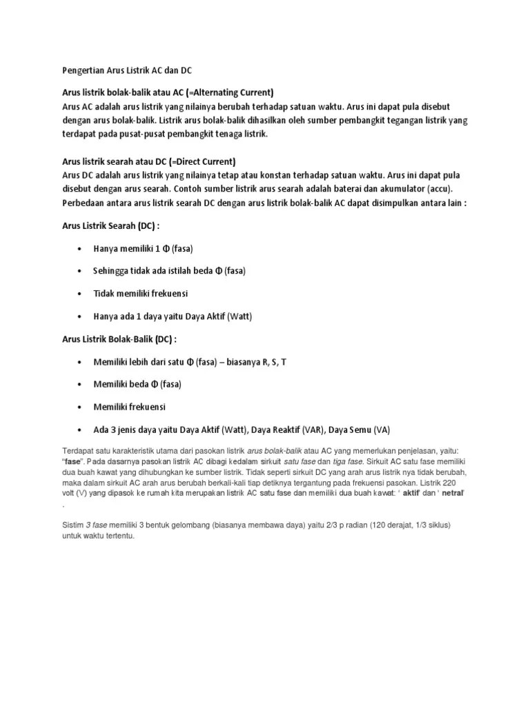 Ac dalam bahasa inggris adalah alternating current, dc adalah direct current. Arus listrik dc adalah arus searah. Perbedaan antara arus ac dan dc adalah arus searah bersifat stabil dan searah yaitu aliran elektron selalu dalam arah maju. Arus searah (direct current) adalah arus yang mengalir dalam arah yang tetap (konstan). Arus listrik ac adalah arus bolak balik.